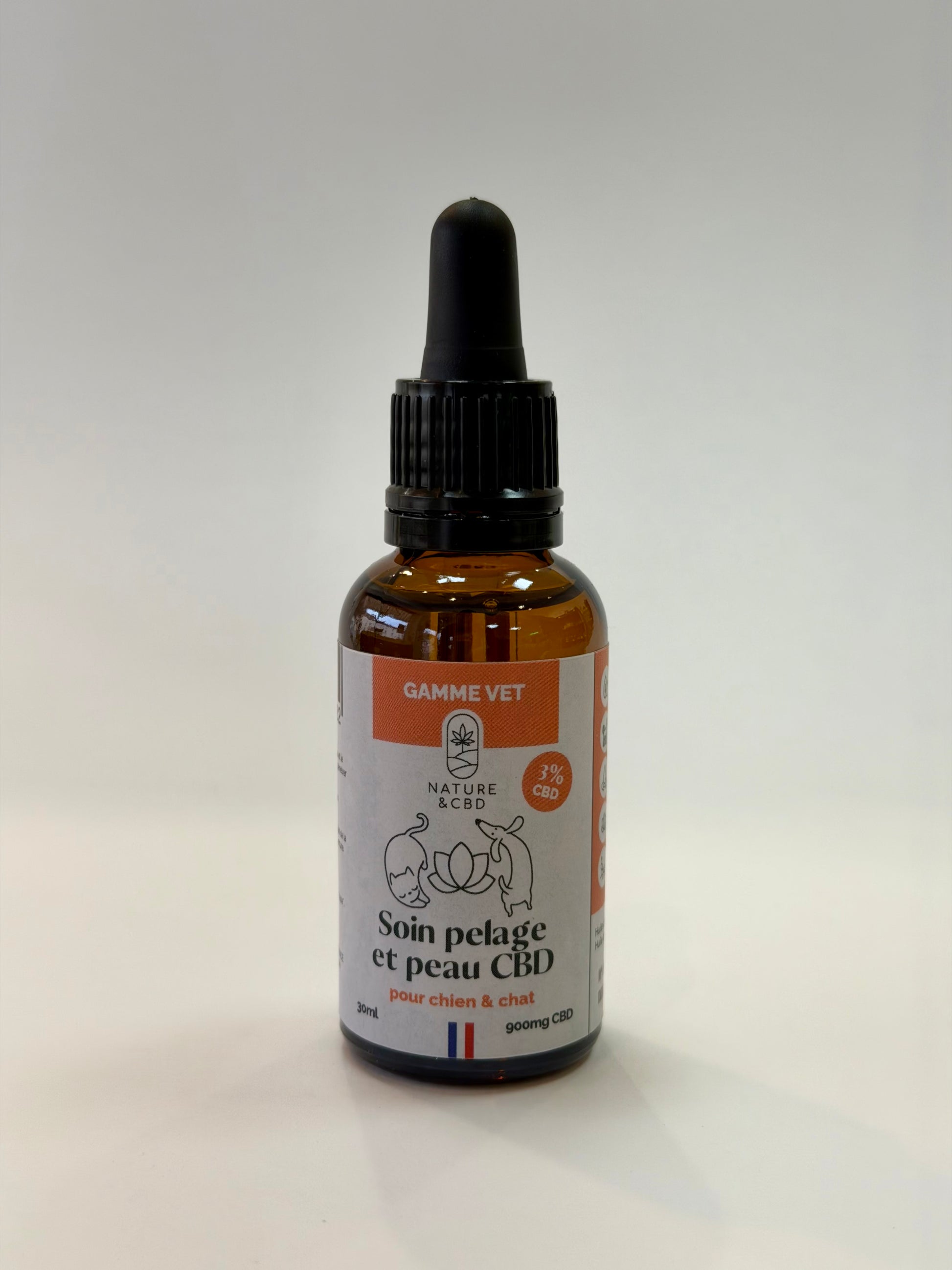 Flacon en verre 30 ml avec pipette compte-goutte pour une application précise : directement sur le pelage, ou dans la main avant massage.